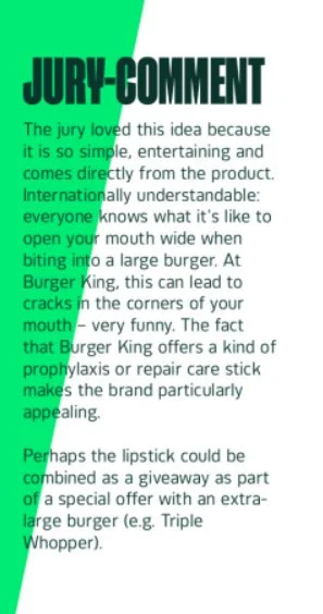 At Burger King, this can lead to cracks in the corners of your mouth β very funny. The fact that Burger King offers a kind of prophylaxis or repair care stick makes the brand particularly appealing.