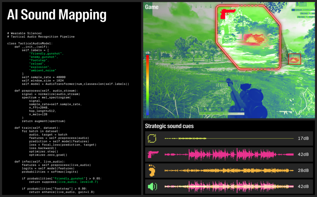 We integrate AI technology into BOSE headphones. Unlike traditional gaming headsets that simply amplify low frequencies, our AI is trained to recognize a wide range of gunfire sounds.